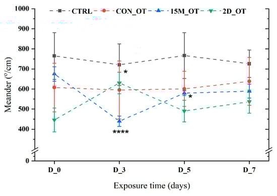 The meander parameter of the experimental groups during the locomotor activity test. D stands for day and OT for oxytocin, gray line: control (CTRL), red line: continuous exposure to OT (CON_OT), blue line: fifteen min exposure every day (15M_OT), green line: fifteen min exposure every two days (2D_OT). The data are expressed as mean ± SEM (n = 10); * p < 0.05 and **** p < 0.01 ANOVA, Tukey is significant compared to the results from D_0 that were set as the initial behavior of each experimental group.