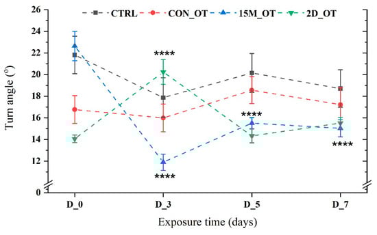 A significant effect triggered by the OT in the group exposed daily for 15 min was recorded for the turn angle parameter. Compared to the initial behavior (22.6 ± 1.35 °), the rate of turn decreased for all the experimental days as follows: D_3 (11.8 ± 0.7°, p = 0.0001 ANOVA, Tukey’s test), D_5 (15.5 ± 0.5°, p = 0.0001 ANOVA, Tukey’s test), and D_7 (15.02 ± 0.7°, p = 0.0001 ANOVA, Tukey’s test) (Figure 10). In contrast, the 2D_OT group exhibited an increase in turning rate on D_3 (20.2 ± 1.1°, p = 0.0001 ANOVA, Tukey’s test) compared to D_0 (14.1 ± 0.35°) and the activity on the other experimental days (Figure 10). There were no changes for the CTRL and CON_OT groups (p = 0.95 and p = 0.63 ANOVA).