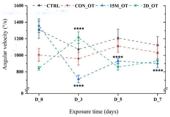 Finally, to complete the swimming pattern of the fish, angular velocity was also measured. Similar to the previous parameter, the activity of the fish exposed daily for 15 min indicated a reduction in the angular velocity values as compared to D_0 (1358.4 ± 81.3°/s) for D_3 (713.9 ± 45.1°/s, p = 0.0001 ANOVA, Tukey’s test), D_5 (930.8 ± 30.2°/s, p = 0.0001 ANOVA, Tukey’s test), and D_7 (901.7 ± 47.1°/s, p = 0.0001 ANOVA, Tukey’s test) (Figure 11). The group exposed to OT every two days had, for the majority of the time, similar activity to that of D_0 (843.2 ± 21.3°/s), except for the third day (1214 ± 68.7°/s, p = 0.0001 ANOVA, Tukey’s test), which recorded an important increase, as can be seen in Figure 11.