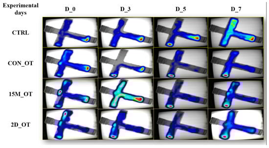 The time spent in the maze areas of the experimental groups, control (CTRL), continuous exposure to OT (CON_OT), fifteen min exposure every day (15M_OT), and fifteen min exposure every two days (2D_OT), during the aggression test by heatmap representations. D stands for day and OT for oxytocin. D_0 was considered as initial behavior.