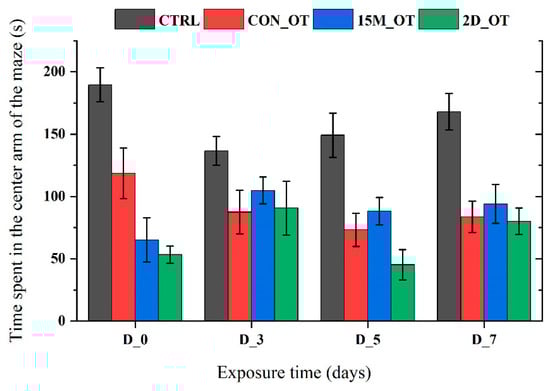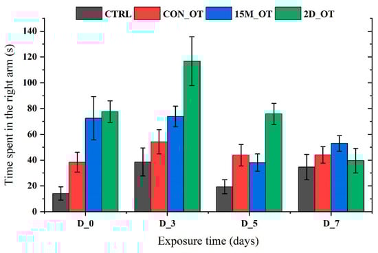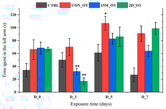 In line with this, the time spent in the left arm was quantified, and its graphical representation is shown in Figure 13. It seems that OT had decreased the time spent in the left arm of the 15M_OT (32.1 ± 4.9 s, p = 0.01 ANOVA, Tukey’s test) and 2D_OT (16.8 ± 5.3 s, p = 0.003 ANOVA, Tukey’s test) groups after the first three days of exposure compared to the natural behavior observed in D_0 (68.4 ± 9.1 s and 66.9 ± 2.8 s). In addition, the CON_OT group revealed an increase in the time spent next to the stimulus in D_5 (106.8 ± 10.7 s, p = 0.04 ANOVA, Tukey’s test) vs. D_0 (65.8 ± 15.3 s). There were no significant results for the CTRL group (p = 0.16 ANOVA).