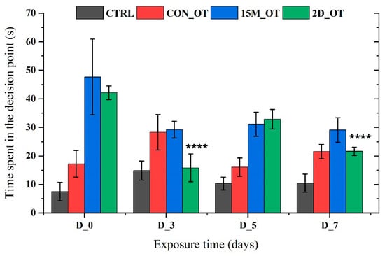 The time spent in the decision point arm did not reveal too many changes, except for the ones from the 2D_OT group. Consequently, the fish’s activity in this area had decreased in D_3 (15.8 ± 4.8 s, p = 0.0001 ANOVA, Tukey’s test) and D_7 (21.6 ± 1.4 s, p = 0.0001 ANOVA, Tukey’s test) vs. D_0 (42.1 ± 2.1 s), when the fish tended to spend more time before choosing their swimming direction (Figure 16).
