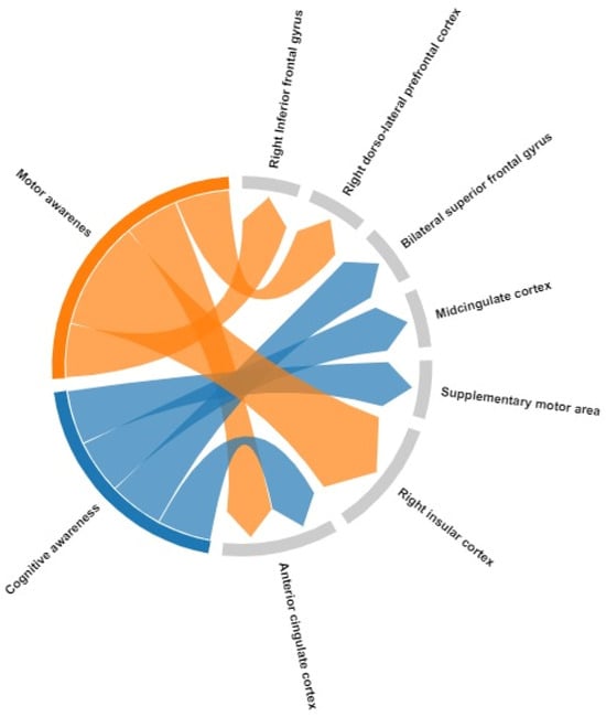 Graphical representation of cortical regions involved in motor and cognitive awareness in PD patients (OFF state or drug-naïve patients). Chord size depicts the number of studies in which the specific brain region was found to be associated with unawareness.