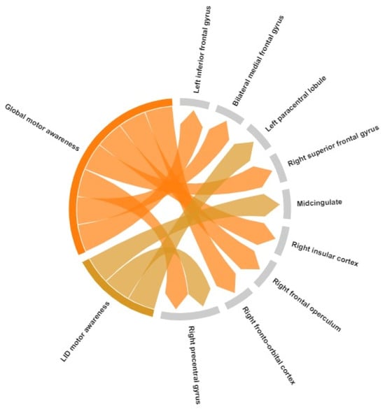 Graphical representation of cortical regions involved in motor awareness in PD patients (ON state). LID = levodopa-induced dyskinesia. Chord size depicts the number of studies in which the specific brain region was found to be associated with unawareness.