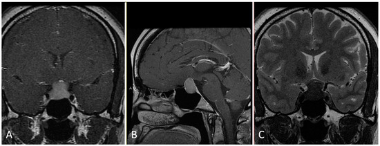 Preoperative imaging of a 38-year-old patient with bitemporal hemianopsia and a sellar lesion consistent with Rathke’s cleft cyst. (A) Coronal T1 post-contrast MRI. (B) Sagittal T1 post-contrast MRI. (C) Coronal T2 MRI.