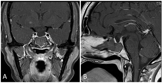 Postoperative imaging consistent with gross total resection of craniopharyngioma. (A) Coronal T1 post-contrast MRI. (B) Sagittal T1 post-contrast MRI.