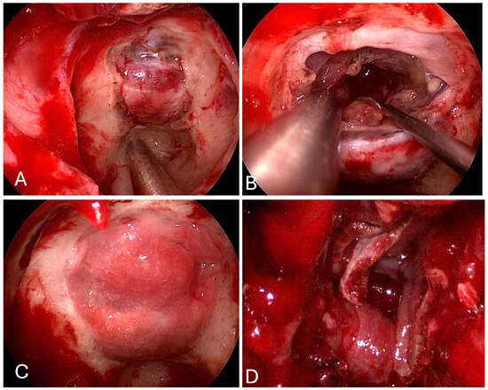Intraoperative imaging of craniopharyngioma resection. (A) Sellar exposure. (B) Tumor resection. (C) Sellar onlay reconstruction. (D) Nasoseptal flap reconstruction.