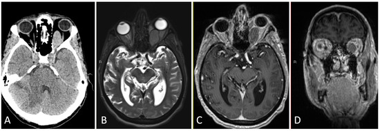 Preoperative imaging of a 62-year-old male with known metastatic neuroendocrine tumor presenting with left eye proptosis and a left intraconal medial orbital apex lesion with optic nerve compression. (A) Axial CT without contrast. (B) Axial T2-weighted MRI. (C) Axial T1 post-contrast MRI. (D) Coronal T1-post-contrast MRI.