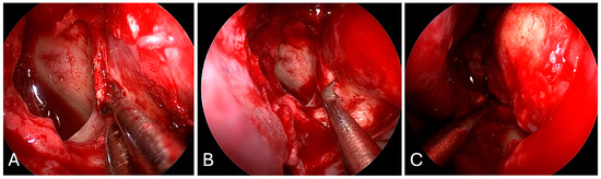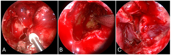 Intraoperative imaging of modified Denker’s maxillary antrostomy and transpterygoid approach to petrous apex cholesterol granuloma. (A) Back wall of the maxillary sinus is opened to access the pterygopalatine fossa. (B) Transpterygoid approach with suction resection of the granuloma. (C) Nasoseptal flap reconstruction.