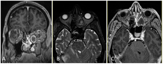 Postoperative imaging demonstrating complete resect of a left intraconal metastatic lesion and endoscopic endonasal optic nerve decompression. (A) Coronal T1 post-contrast MRI. (B) Axial T2-weighted MRI. (C) Axial T1 post-contrast MRI.