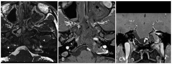 Postoperative imaging demonstrating decompression of a petrous apex cholesterol granuloma. (A) Axial T2 high-resolution constructive interference steady state (CISS) T2-weighted MRI. (B) Axial T1 post-contrast MRI. (C) Coronal T1 post-contrast MRI.