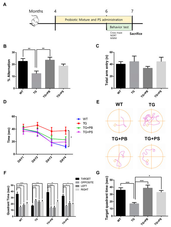 Probiotics alleviated the memory defect in 5xFAD mice. (A) The experimental procedure for the mice is displayed. (B,C) The cross maze and (D–G) Morris water maze were utilized to assess the learning and memory of mice. (B) In the cross maze test, the loss of the alternation rate was attenuated by probiotics, (C) but no changes in the number of total arm entries of the 5xFAD mice were seen. (D–G) Probiotics also diminished the defects in learning and memory in the Morris water maze test. (D) Escape latency during the learning phase. (E) Representative track plot of Day 4. (F) Time spent in each quadrant (seconds) during the probe phase. Treatment, F (3, 35) = 0.4372, p = 0.7278; Quadrant time, F (3, 105) = 16.58, p < 0.0001; Interaction Treatment × Quadrant time, F (9,105) = 5.365, p < 0.0001 was analyzed using two-way ANOVA, post hoc Tukey’s test. (G) Target quadrant time (seconds) in the probe phase. WT: Wild type, n = 13; TG: 5xFAD transgenic mice, n = 9; TG + PB: Probiotic-treated 5xFAD transgenic mice, n = 9; TG + PS: Phosphatidylserine-treated 5xFAD transgenic mice, n = 8. One-way analysis of variance (ANOVA) test; two-way ANOVA test; n.s, not significant; *, p < 0.05; **, p < 0.01; ***, p < 0.001; ****, p < 0.0001.