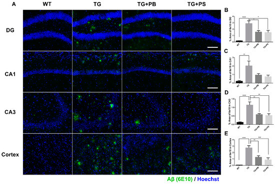 Probiotics decreased amyloid-β (Aβ) accumulation in the hippocampus and cerebral cortex in 5xFAD mice. (A) Representative immunohistochemistry images of the hippocampus and cerebral cortex. Scale bar = 100 μm. (B–E) Probiotics significantly decreased the Aβ level as quantified as the percent area of Aβ staining (6E10 positive) in the dentate gyrus (DG), Cornu Ammonis (CA) 1, CA3, and cortex in 5xFAD mice. Phosphatidylserine showed a similar protective effect. WT: Wild type, n = 6; TG: 5xFAD transgenic mouse, n = 6; TG + PB: Probiotics-treated 5xFAD transgenic mice, n = 6; TG + PS: Phosphatidylserine-treated 5xFAD transgenic mice, n = 5. One-way analysis of variance (ANOVA) test; *, p < 0.05; **, p < 0.01; ***, p < 0.001; ****, p < 0.0001.
