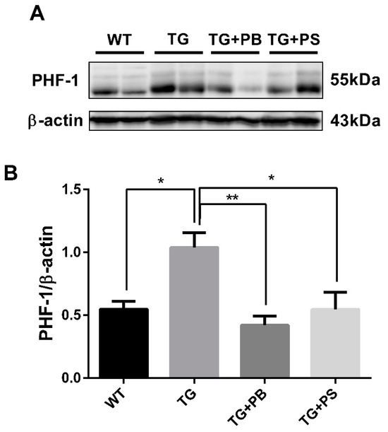 Probiotics reduce p-tau (s396, s404; PHF-1) in the cerebral cortex. (A) A representative Western blot of the cerebral cortex revealed that the level of phosphorylated tau (PHF-1) was significantly decreased in the 5xFAD group treated with probiotics when compared to that of the vehicle-treated 5xFAD group. A similar effect was observed in mice subjected to phosphatidylserine. (B) Immunoblot quantification of phosphorylated tau. WT: Wild type, n = 4; TG: 5xFAD transgenic mouse, n = 4; TG + PB: Probiotics-treated 5xFAD transgenic mouse, n = 4; TG + PS: Phosphatidylserine-treated 5xFAD transgenic mouse, n = 4. One-way analysis of variance (ANOVA) test; *, p < 0.05; **, p < 0.01.