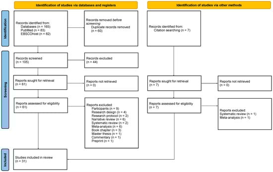 As shown in the PRISMA flow chart (Figure 1), 165 records were identified from searching across six databases. After duplicate removal, a total of 105 records were screened at the title and abstract levels. Manual searches from the articles’ references generated seven relevant records that were considered for full-text screening. A total of 68 reports (61 from the databases and 7 from the manual searches) were evaluated for full-text eligibility. Nine studies were excluded as they had been conducted on animals, healthy subjects, and patients with a primary diagnosis other than PTSD, i.e., specific phobia, persistent post-concussion syndrome, treatment-resistant depression, suicide behavior disorder, and traumatic brain injury syndrome. Three were correlational studies; one was a single-case study; and two were study protocols. Six narrative reviews, two systematic reviews, six meta-analyses, one Master-level dissertation, three book chapters, one commentary, and one preprint were also kept out of this work. Overall, 31 studies met the inclusion criteria for the data extraction process and, thus, were included in this systematic review [26,51,52,53,54,55,56,57,58,59,60,61,62,63,64,65,66,67,68,69,70,71,72,73,74,75,76,77,78,79,80].