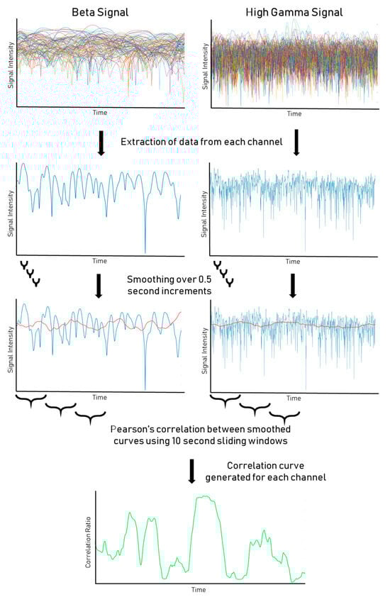Our methodology of +HBC was detailed in our prior publication []. We computed power–power correlations using a 4th order Butterworth to bandpass signals to corresponding HG (70–200 Hz) and Beta 1 (12–18 Hz) frequency bands for each electrode site and estimated log power (e.g., amplitude envelope) by computing the natural logarithm of the square of the analytical amplitude of the Hilbert transform []. We then smoothed the estimated amplitude envelope using a Gaussian filter transform with a sliding window mean. Our signals were acquired with some patients at 1000 Hz (n = 6) and some at 2000 Hz (n = 16), due to improved recording capabilities at our institution over the period studied. Smoothing windows used a duration of 0.5 s (Figure 1). The smoothed HG and Beta power estimates were then correlated using Pearson’s correlation using a staggered window of 10 s (Figure 1). This window was advanced stepwise from the first sample to the length of the total signal, with each step being the same length as the window.