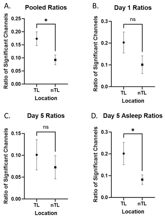 Temporal versus non-temporal signals. Comparisons labeled with “ns” are not statistically significant. Comparisons labeled with “*” are statistically significant at an alpha of 0.05. (A) Pooled ratios (day 1, day 5, day 5 asleep) comparing tagged electrodes from TL and nTL areas (contralateral temporal lobe included with non-temporal areas). (B–D) Day 1, day 5, and day 5 signals individually compared between TL and nTL areas.