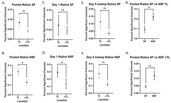 Seizure-free versus non-seizure-free. Comparisons labeled with “ns” are not statistically significant. Comparisons labeled with “*” are statistically significant at an alpha of 0.05. (A,B) Combined ratios comparing SF and NSF patients. (C,D) Day 1 comparing SF and NSF patients. (E,F) Day 5 asleep comparing SF and NSF patients. (E,F) SF vs. NSF directly compared looking at only TL (G) and nTL (H) electrodes.