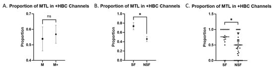 MTL vs. LTL +HBC Channels. Combined ratios comparing the proportion of +HBC channels located in the MTL to all TL +HBC channels. Comparisons labeled with “ns” are not statistically significant. Comparisons labeled with “*” are statistically significant at an alpha of 0.05. (A) Mean ± SEM in M versus M+ onset patients. (B) Mean ± SEM in SF versus NSF patients grouped together. (C) Individual values with the median in SF versus NSF patients.