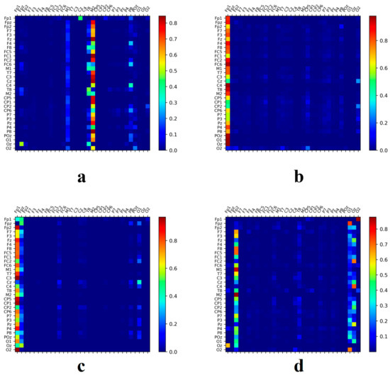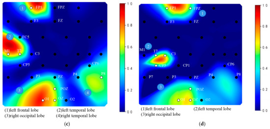 The neural activation pattern of trained subjects under sad musical stimulation. (a) Band θ; (b) Band α; (c) Band β; (d) Band γ.