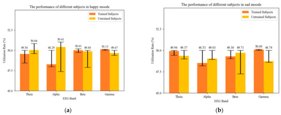 The initial learning rate of the model is set at . When the recognition rate reaches 70%, it is reduced to and further adjusted to upon reaching an 85% accuracy rate. Each subject’s model undergoes 50 iterative updates with a batch size of 32. This batch size can be adjusted based on the training conditions of individual subjects, with the majority achieving optimal results at batch sizes of 32 or 64. In addition to using the overall recognition rate as an evaluation criterion, this study also analyses the recognition rate for each state and the contribution rate of each frequency band, aiming to comprehensively evaluate the classification performance and effectiveness of our model from multiple perspectives.
