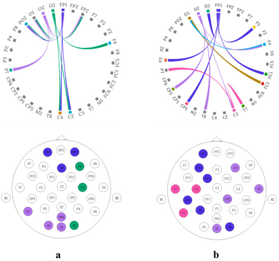 Comparison of brain connectivity among subjects with different training levels under happy musical stimulation: (a) untrained subjects; (b) trained subjects.