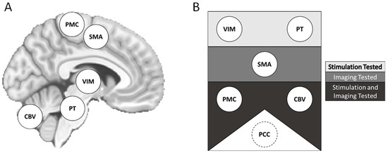 Proposed central oscillatory network (CON) components and methods of assessment. Potential elements of the proposed CON represented on a template brain (A). Components are also displayed by the approaches used for study (B). Components in the top rectangle were investigated with neurostimulatory approaches. Components in the middle rectangle, neuroimaging approaches. Components in the bottom rectangle, both neurostimulation and neuroimaging approaches. The PCC was included as a non-CON region of interest. CON = central oscillatory network. CBV = cerebellar lobule and cerebellar vermis. PMC = primary motor cortex. PCC = posterior cingulate cortex. PT = pontine tegmentum. SMA = supplementary motor area. VIM = ventralis intermedius of the thalamus.