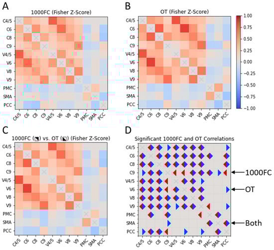 PCC was included to assess the integrity of a brain network not typically associated with motor functions—the DMN. Similar to prior reports, the analysis of PCC RSFC revealed several clusters within the CON []. We observed RSFC between PCC and PMC, SMA, and cerebellum (Figure S3 and Table S19). Analysis of the 1000FC data alongside OT revealed high spatial correlation and moderate overlap (r = 0.84, Dice’s coefficient = 0.38). Congruence of PCC RSFC between datasets suggests that the DMN is generally maintained in OT, and changes may be limited to CON regions.