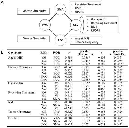 Significant correlations between RSFC of ROI pairs and disease or demographic variables. (A) CON components are represented in solid circles while non-CON components are in dashed circles. Arrows between circles signify at least one significant correlation between ROI pairs and disease/demographic variables were detected. Text boxes disclose what disease/demographic variable/s were significant for their associated arrow. (B) Both Pearson’s and Kendall’s correlation values and significance values are also displayed. Nonsignificant correlations are italicized. RSFC = resting state functional connectivity. ROI = region of interest. C = cerebellar lobule. CBV = cerebellum and cerebellar vermis. PCC = posterior cingulate cortex. PMC = primary motor cortex. SMA = supplementary motor area. V = cerebellar vermis. * = significant correlation.