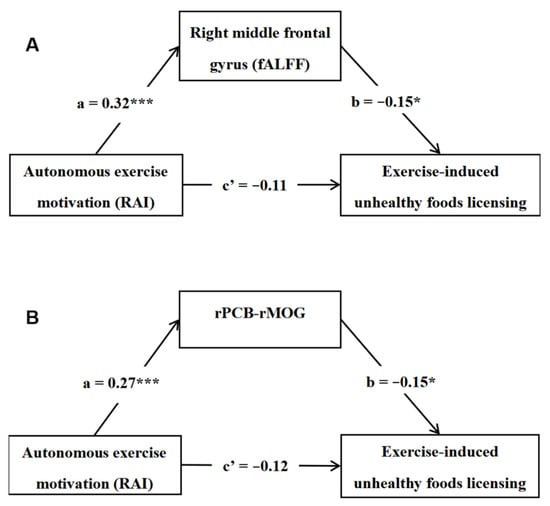 To examine whether the resting-state brain activity/connectivity could mediate the relationship between autonomous exercise motivation (RAI) and exercise-induced unhealthy foods licensing (EUFL), we conducted a mediation analysis. Sex, age, and FD were also controlled as covariates. As depicted in Figure 3A, the fALFF in the right MFG totally mediated the relationship between RAI and EUFL (indirect effect = −0.05, 95%CI [−0.10, −0.01]). The mediating effect accounted for 29.76% variation of the total effect (c = −0.15, p < 0.05). In addition, as presented in Figure 3B, the rsFC between the right PCB and the right MOG also totally mediated this relationship (RAI → rPCB–rMOG → EUFL; indirect effect = −0.04, 95%CI [−0.09, −0.01]). And this mediating effect explained 25.08% variation of the total effect (c = −0.15, p < 0.05).