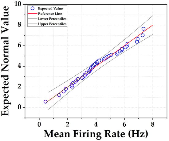 Quantile–quantile (QQ) plot depicts the normal distribution of mean firing rate (MFR) of 48 individual neuronal networks, each containing approximately 105 cells. MFR values were obtained from individual networks on a typical MEA plate under control conditions.