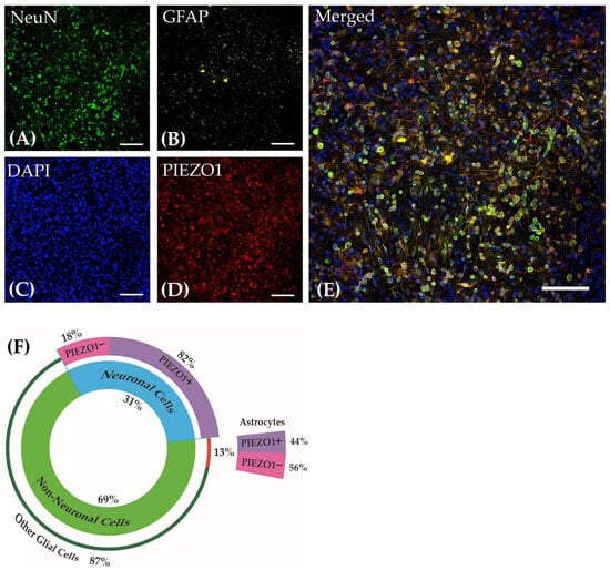 Cortical cultures derived from embryonic mice on DIV21 stained for (A) Neuronal Nuclear Protein (NeuN), (B) Glial Fibrillary Acidic Protein (GFAP), (C) DAPI, and (D) PIEZO1. (E) Merged image of all channels. Images were taken at 40× magnification. Scale bar = 50 µm. (F) The pie chart reflects the percentage distribution of the cell types in the cortical culture and their co-localization percentage with PIEZO1.