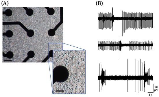 Prior work has shown that electrically active cells, including cortical neurons, can be readily cultured on MEAs for a wide range of applications [,,,,,]. MEAs resolve and record individual extracellular action potentials or spikes []. Complementary to single cell patch-clamp electrophysiology, extracellular action potentials are recorded noninvasively, enabling long-term and/or repeated monitoring of large cell populations. MEAs enable high-content quantitative measures of cellular excitability, such as spike rate, amplitude, bursting rates, and neuron firing synchronization [].