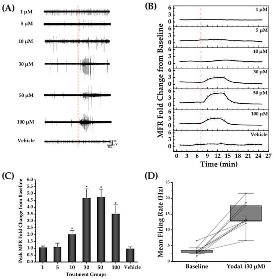 Yoda1 transiently enhanced the mean firing rate of the neuronal networks. A total of 105 viable cells were seeded per cultured network. The number of cultured networks for each concentration represented in (B,C) is as follows: 1, 5, 50, and 100 µM (n = 4 networks); 10 µM (n = 10 networks); 30 µM (n = 9 networks); and vehicle (DMSO control, n = 3 networks). (A) Representative electrode raw voltage traces showing the transient elevation of spike activity after exposure to different concentrations of Yoda1 but not the largest concentration of vehicle (DMSO control). The red dotted line indicates the Yoda1 and DMSO (vehicle) administration time points. (B) Normalized MFR versus time for the Yoda1 treatment groups and control. The time corresponding to Yoda1 and DMSO (vehicle) administration is represented by the red dotted line. (C) Peak fold change in MFR from the baseline for each of the Yoda1 concentrations and vehicle. The results of the paired t-test showed a significant increase in MFR from the baseline in the groups treated at 10, 30, 50, and 100 µM of Yoda1. No significant change was identified in the lower concentrations of Yoda1 and the largest concentration of DMSO (vehicle). * indicates a statistically significant difference at p < 0.05. (D) Box plot illustrating the effect of 30 µM of Yoda1 on activity of nine representative neuronal networks.