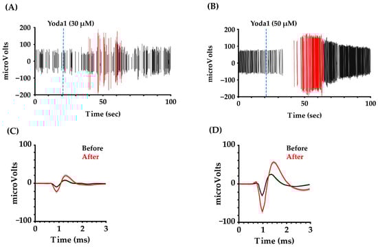 Yoda1 exposure shifted the peak-to-peak amplitude of the spikes. (A,B) show 100 s of recording from representative units on networks treated with Yoda1 at 30 and 50 µM concentrations, respectively. The time corresponding to Yoda1 administration is represented by the blue dotted line. Spikes with lower peak-to-peak amplitude are depicted by black lines, whilespikes with higher peak-to-peak amplitude are represented by the red lines. (C,D) show unit waveforms (mean ± STD) detected before and immediately after administration of Yoda1 at 30 and 50 µM, respectively.