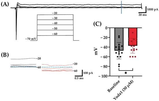 Yoda1 exposure induced a statistically significant shift in reversal potential. (A) Representative membrane current traces, evoked by the voltage step protocol shown in the inset during application of bath solution, with a vertical blue line indicating where quantitative measurements were performed. (B) Representative current traces at 300 ms before (black) and after (red) 30 µM Yoda1 application at voltages from −60 to −20 mV. Blue dashed lines denote 0 pA levels. (C) Statistically significant shift in cellular reversal potential from baseline with exposure to 30 µM Yoda1 (p = 0.015). * = p < 0.05. Analysis was conducted on 16 recorded neurons.