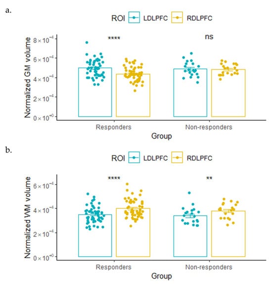 Comparison of normalized (a) gray matter (GM) or (b) white matter (WM) volumes (mean ± SE) between left DLPFC and right DLPFC for responders and non-responders under active treatment. Normalized volume is calculated by dividing each region’s raw volume of GM or WM by the total intracranial volume (TIV). Results of the two-tailed paired t-test are shown (**** p ≤ 0.0001, ** p ≤ 0.01, and ns: p > 0.05).