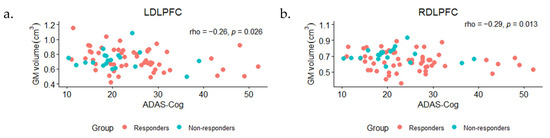 Spearman’s correlation analysis for non-normally distributed data was computed between raw data points of GM volume in the ROIs of responders and non-responders and their baseline ADAS-Cog scores. As shown in Figure 3, a significant correlation was observed between baseline ADAS-Cog scores and GM volume in the left DLPFC (rho = −0.26, p = 0.026) and right DLPFC (rho = −0.29, p = 0.013). After controlling for age, sex, and TIV in the partial correlation analysis, GM volume in the right DLPFC of responders and non-responders showed a significant correlation (rho = −0.23, p = 0.048) with baseline ADAS-Cog scores.