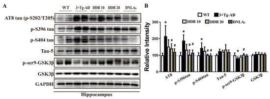 3.3. DDB Attenuates Tau Hyperphosphorylation in 3 × Tg-AD Mice