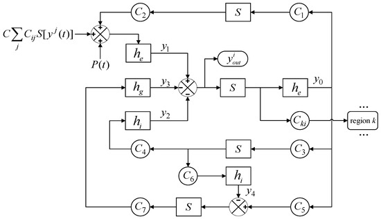 In order to construct a WBNM, we need to select a model as a node. An NMM consists of a series of differential equations and provides a new way to study the brain’s rhythmic activity and the neural mechanisms of functional diseases of the brain [7]. A key strength of NMMs over alternative statistical mathematical frameworks lies in their foundation on anatomical and neurophysiological principles with state variables and parameters that possess well-defined physiological interpretations. This feature provides a substantial correspondence between the mathematical model and the actual EEG signal, and it makes the use of NMMs more reliable when analyzing actual EEG signals [8,9,10,11,12]. Freeman [13] initiated the “neural mass” concept by aggregating the activities of neuronal groups into a lumped parameter framework, while its mathematical underpinnings were elaborated by Wilson and Cowan [14]. Subsequently, Lopes da Silva et al. [15] introduced the alpha rhythm model (ARM), which integrated two thalamic neuronal populations to mimic thalamic alpha rhythms, underscoring the thalamus’s critical function in conveying sensory information to the cerebral cortex [16]. On this foundation, Jansen and Rit [17] developed the more sophisticated cortical NMM, which was termed the J&R model and was aimed at modeling the visual cortex’s responses to visual stimuli. This model is distinguished by its ability to produce alpha waves using three distinct neuronal populations: pyramidal cells and both excitatory and inhibitory interneurons. Further extending this framework, Wendling et al. [18] incorporated an additional fast inhibitory interneuron class into the J&R model, categorizing the inhibitory neurons into slow and fast subgroups for enhanced model fidelity. In this study, they chose the Wendling model for the nodes of their WBNM. The following were the main reasons: Compared to simple models that only include excitation inhibition circuits, Wendling models have rich dynamic characteristics and can generate six common EEG signals, including background noise, typical alpha waves, and epileptic spike waves; the Wendling model has been widely used in the study of the cerebral cortex, especially for seizures and the transmission mechanism of epilepsy [19,20,21]; the structure of the Wendling model is relatively simple, and the computational cost of constructing a WBNM is tolerable. Ursino [22] developed a new model by modifying the structure of the fast inhibition circuits of the Wendling model, and it was able to generate gamma waves but also had a correspondingly increased. Therefore, its application is not as widespread as that of the Wendling model.