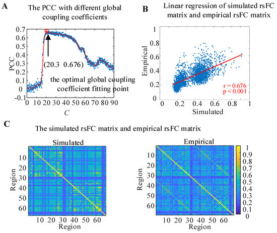 In order to make the functional connections of the WBNM closer to the empirical connections of an actual brain, the Pearson correlation coefficient (PCC) between the simulated rsFC matrix of the WBNM and the empirical rsFC matrix with different global coupling coefficients C and with a step size of 0.1 was calculated and is shown in Figure 3A. The scatter points were marked in blue, and a red solid line was used to fit the scatter plot to represent the trend of correlation changes with different global coupling coefficients, for which the Savitzky–Golay filtering method was adopted. The larger the correlation value, the better the simulated brain functional connection fit the empirical brain functional connection. The results showed that when the global coupling coefficient increased, the correlation showed a trend of first increasing and then decreasing. The correlation increased when C was greater than 70 and then decreased again when C was greater than 75. The correlation reached a maximum value of 0.676 with a significance level of p < 0.001 when the global coupling coefficient was C = 20.3, as marked with a red circle. At this point, the simulated rsFC matrix of the constructed WBNM and the empirical rsFC matrix had the highest similarity, and the WBNM was closest to an actual brain network. Therefore, all subsequent analyses of the WBNM were based on the global coupling coefficient C = 20.3, which is called the optimal global coupling coefficient fitting point.