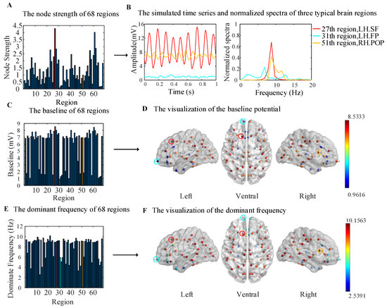 The baseline potential and dominant frequency of the simulated output signals for all regions are shown in Figure 4C–F. In Figure 4C, the bar plot shows the baseline potential, which was visualized on left, ventral, and right cortical surface MNI templates in Figure 4D by using the BrainNet Viewer toolbox [35]. The color of the sphere represents the magnitude of the baseline potential, and the three representative brain regions are marked with red, bright blue, and orange circles. The baseline potentials of the corresponding brain regions in the left and right hemispheres were basically symmetrical. The brain regions with a baseline of larger than 4 mV were almost located in the parietal and occipital regions and are marked with red color, and those with less than 4 mV were located in the frontal and temporal regions and are marked with blue color, as shown in Figure 4D.