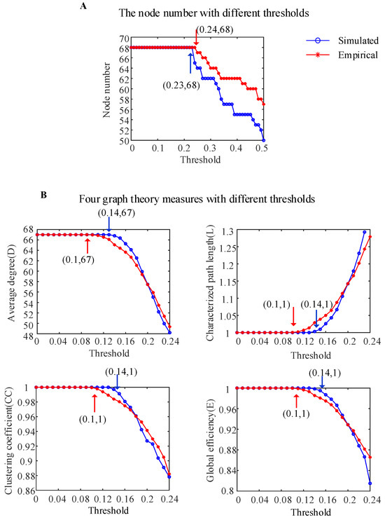 The characteristics of the simulated WBNM and empirical brain network based on graph theory. (A) The node numbers with different thresholds for the two networks. (B) Four graph-theoretical measures with different thresholds for the two networks.