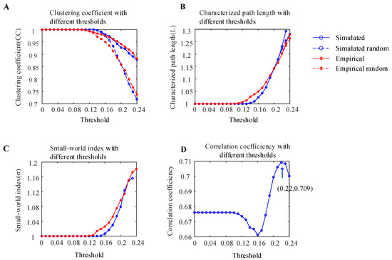To measure whether the simulated WBNM and empirical brain network constructed in this experiment had small-world network properties, the clustering coefficients and characteristic path lengths of simulated random brain networks and empirical random brain networks with the same numbers of nodes and edges were calculated under different thresholds, as shown in Figure 6A,B. As the threshold increased, the clustering coefficients CC of all four types of brain networks showed a downward trend, and the clustering coefficients CC of the simulated and empirical brain networks were greater than those of random brain networks. The characteristic path lengths L of the four types of brain networks showed an upward trend, and the characteristic path lengths L of the simulated and empirical brain networks were similar to those of random brain networks.