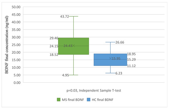 BDNF differences between treated MS and the HC. Boxplot graph presenting the differences between BDNF levels after the treatment of PwMS (in green) and HC (in blue). The Independent Sample T-Test reveals statistically significant differences between the groups (p = 0.003), with the HC group having significantly lower BDNF values. BDNF, brain-derived neurotrophic factor; HC, healthy control; MS, multiple sclerosis. X, mean value; lower box limit, 25% quartile value; central line, median value; upper box limit, 75% quartile value; lower whisker, minimum value; upper whisker, maximum value.
