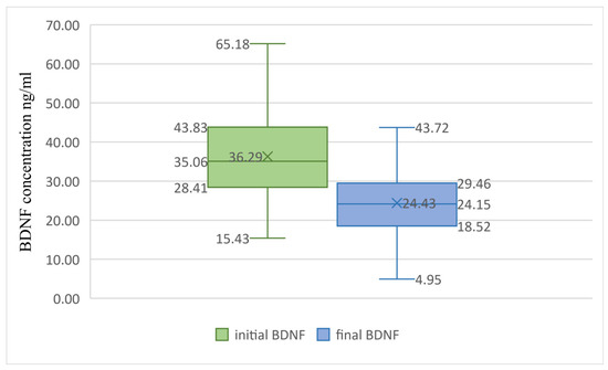 BDNF differences in time for PwMS. Boxplot graph presenting the differences between baseline BDNF levels (in green) and BDNF levels after treatment (in blue). The Paired Sample T-Test reveals statistically significant differences between the groups (p = 0.001), with the final BDNF values being significantly lower. BDNF, brain-derived neurotrophic factor. X, mean value; lower box limit, 25% quartile value; central line, median value; upper box limit, 75% quartile value; lower whisker, minimum value; upper whisker, maximum value.