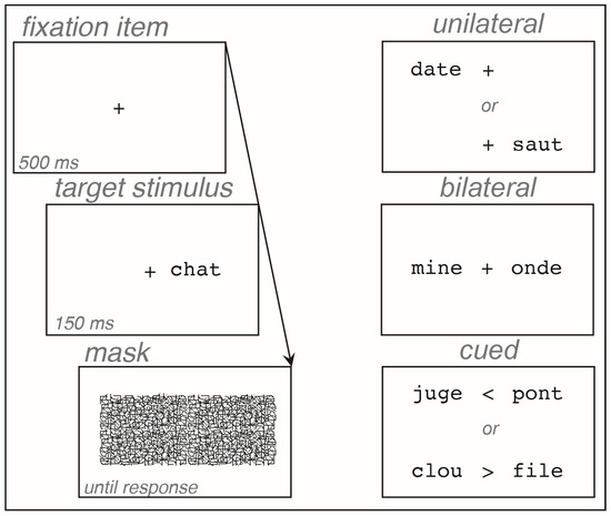 The stimuli were 120 French four-letter words. Eight lists of 15 words were created: six for target words in the six conditions (three presentation blocks × 2 visual hemifields), and two for filler words in the cued block. The eight lists consisted of four-letter monosyllabic words, matched for written frequency, from 3.59 to 3.77 per 100 million [47]; for the number of orthographic neighbors, from 66 to 88 per list, with 14 words per list having at least one orthographic neighbor [48]; for imageability, with a mean score per list between 1.93 and 2.40 on a subjective scale ranging from 1 to 3; and for shape, with a similar number of ascenders or descenders in the letters. All letters were presented in lowercase, using 30-point Courier font. The fixation item, a + sign, was presented in the middle of the screen, subtending a visual angle of 0.4°. Words covered a visual angle of 1.4° and were centered at 1.6° from the fixation item, so the distance between the fixation item and the nearest letter was 0.9°. Arrows in the cued block were “<” (for left) and “>” (for right) symbols in place of the fixation item and subtended 0.6° of visual angle. A patterned mask made of irregular lines covered the whole display with a visual angle of 7.2° × 3.2°. All stimuli were presented in black on a white video screen. Participants sat approximately 57 cm from the screen so that 1 cm on the screen corresponded to 1° of visual angle.