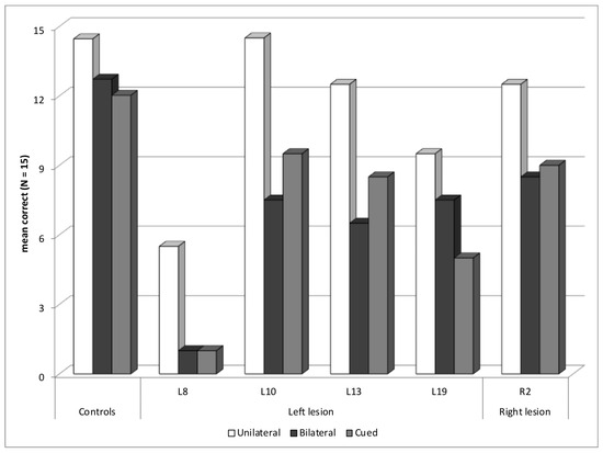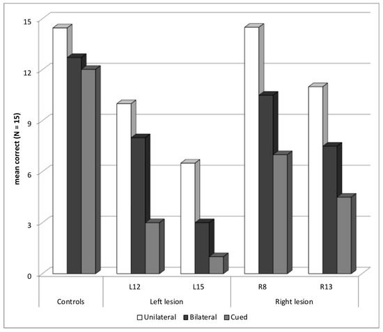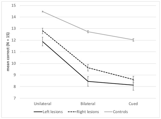 There was an effect of Presentation block, F(2, 204) = 201.14; p < 0.001; η2 = 0.66, with a gradation of performance between the three presentation blocks; scores were higher in the unilateral (M = 13.7, SD = 2.1) than the bilateral block (M = 11.3, SD = 2.9), and in both these blocks than in the cued block (M = 10.7, SD = 3.0) (ps < 0.001). The interaction between Group and Presentation block was also significant, F(4, 204) = 8.12; p < 0.001; η2 = 0.14. Both left- and right-lesion patients scored lower than healthy controls in all blocks (ps < 0.001), and patients with left lesions had lower scores than patients with right lesions in the unilateral and bilateral blocks (ps < 0.001), but not in the cued block (p = 0.14). Figure 2 also shows that the difference between patients’ and controls’ performance was larger in both bilateral and cued blocks than in the unilateral block.