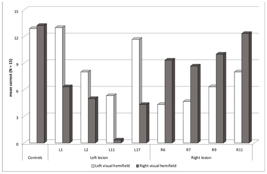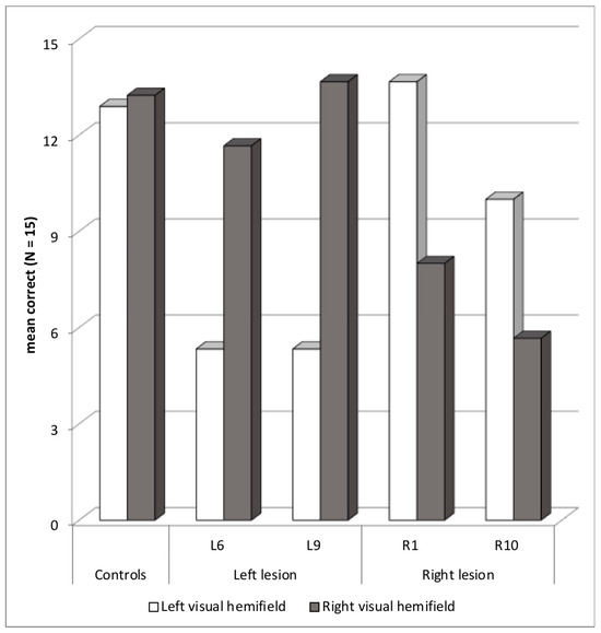 - Dorff, J.E.; Mirsky, A.F.; Mishkin, M. Effects of unilateral temporal lobe removals in man on tachistoscopic recognition in the left and right visual fields. Neuropsychologia 1965, 3, 39–51. [Google Scholar] [CrossRef]