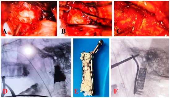Transoral approach under microscope magnification (A–C) shows the resection of the odontoid and the anterior arch of C1. (D) Lateral fluoroscopic view following odontoidectomy. (E) Pre-modeled cervical mesh with 5 mm PMMA spheres. Anterior cervical plate screws are placed within the mesh with PMMA. (F) Lateral fluoroscopic view shows the placement of mesh on the clivus.
